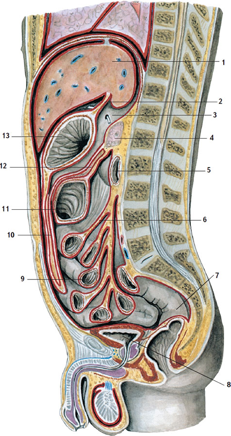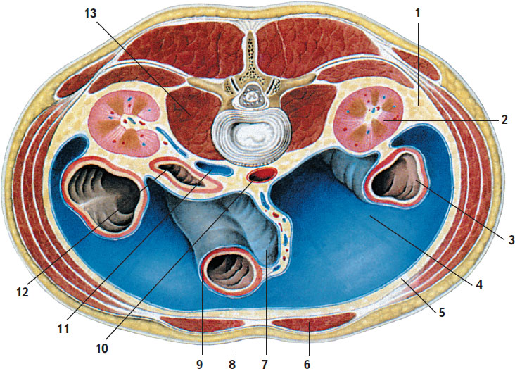 1 – забрюшинное пространство; 2 – почка; 3 – ободочная кишка; 4 – брюшинная полость; 5 – париетальная брюшина; 6 – прямая мышца живота; 7 – брыжейка тонкой кишки; 8 – тонкая кишка; 9 – висцеральная брюшина; 10 – аорта; 11 – нижняя полая вена; 12 – двенадцатиперстная кишка; 13 – поясничная мышца