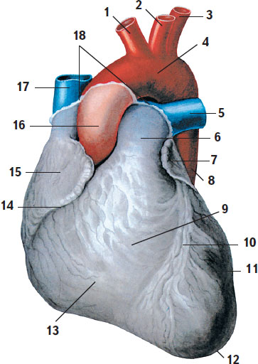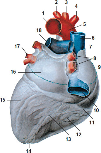 1 – плечеголовной ствол; 2 – левая общая сонная артерия; 3 – левая подключичная артерия; 4 – дуга аорты; 5 – правая легочная артерия; 6 – легочный ствол; 7 – левое ушко; 8 – нисходящая часть аорты; 9 – грудино-реберная поверхность; 10 – передняя межжелудочковая борозда; 11 – левый желудочек; 12 – верхушка сердца; 13 – правый желудочек; 14 – венечная борозда; 15 – правое ушко; 16 – восходящая часть аорты; 17 – верхняя полая вена; 18 – переход перикарда в эпикард