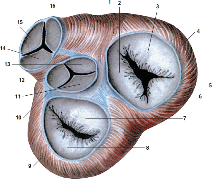 1 – правое фиброзное кольцо; 2 – перегородочная створка; 3 – передняя створка; 4 – правый желудочек; 5 – задняя створка; 6 – правый фиброзный треугольник; 7 – передняя створка левого предсердно-желудочкового клапана; 8 – задняя створка; 9 – левый желудочек; 10 – левый фиброзный треугольник; 11 – правая полулунная заслонка клапана легочного ствола; 12 – левая полулунная заслонка клапана легочного ствола; 13 – передняя полулунная заслонка клапана легочного ствола; 14 – левая полулунная заслонка клапана аорты; 15 – задняя полулунная заслонка клапана аорты; 16 – правая полулунная заслонка клапана аорты