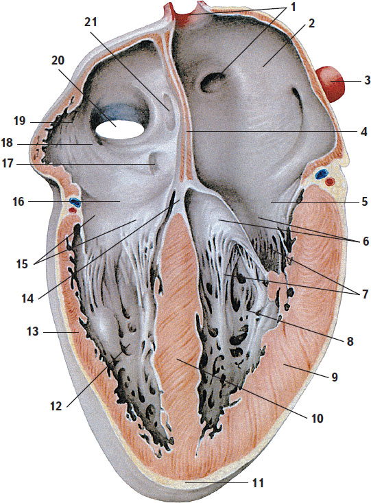 1 – устья правых легочных вен; 2 – левое предсердие; 3 – левая легочная вена; 4 – межпредсердная перегородка; 5 – левое предсердно-желудочковое отверстие; 6 – передняя створка и задняя створка левого предсердно-желудочкового клапана; 7 – сухожильные хорды; 8 – левый желудочек; 9 – миокард левого желудочка; 10 – межжелудочковая перегородка (мышечная часть); 11 – верхушка сердца; 12 – правый желудочек; 13 – миокард правого желудочка; 14 – перепончатая часть межжелудочковой перегородки; 15 – створки правого предсердно-желудочкового клапана; 16 – правое предсердно-желудочковое отверстие; 17 – отверстие венечного синуса; 18 – правое предсердие; 19 – гребенчатые мышцы; 20 – устье нижней полой вены; 21 – овальная ямка