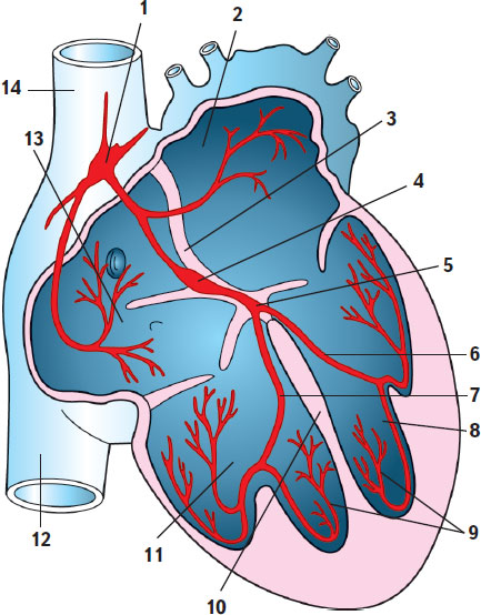 1 – синусно-предсердный узел; 2 – левое предсердие; 3 – межпредсердная перегородка; 4 – предсердно-желудочковый узел; 5 – предсердно-желудочковый пучок; 6 – левая ножка предсердно-желудочкового пучка; 7 – правая ножка предсердно-желудочкового пучка; 8 – левый желудочек; 9 – проводящие мышечные волокна; 10 – межжелудочковая перегородка; 11 – правый желудочек; 12 – нижняя полая вена; 13 – правое предсердие; 14 – верхняя полая вена