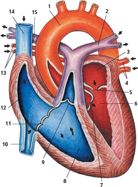 1 – аорта; 2 – левая легочная артерия; 3 – левое предсердие; 4 – левые легочные вены; 5 – правое предсердно-желудочковое отверстие; 6 – левый желудочек; 7 – клапан аорты; 8 – правый желудочек; 9 – клапан легочного ствола; 10 – нижняя полая вена; 11 – правое предсердно-желудочковое отверстие; 12 – правое предсердие; 13 – правые легочные вены; 14 – верхняя полая вена; 15 – правая легочная артерия. Стрелками показано направление тока крови
