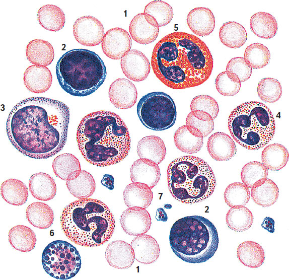 1 – эритроциты; 2 – лимфоциты; 3 – моноцит; 4 – нейтрофильные гранулоциты; 5 – эозинофильные гранулоциты; 6 – базофильные гранулоциты; 7 – тромбоциты