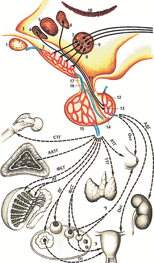 1 – зрительный перекрест; 2 – срединное возвышение с первичной капиллярной сетью; 3 – полость III желудочка; 4–7 – проекции некоторых ядер гипоталамуса на стенку III желудочка [4, 5, 6 – соответственно ядра супраоптическое, переднее (преоптическая зона гипоталамуса), паравентрикулярное; 7 – аркуатовентромедиальный комплекс медиобазального гипоталамуса]; 8 – таламус; 9 – адренергические нейроны медиобазального гипоталамуса, дающие начало нисходящим эфферентным нервным путям; 10 – нейросекреторные пептидадренергические клетки медиобазального гипоталамуса, секретирующие адреногипофизарные гормоны в первичную капиллярную сеть срединного возвышения; 11 – углубление воронки III желудочка и гипофизарная ножка; 12 – задняя доля гипофиза; 13 – накопительные тельца Херринга (окончания аксонов нейросекреторных клеток переднего гипоталамуса – супраоптического и паравентрикулярного ядер на капиллярах задней доли гипофиза); 14 – промежуточная (средняя) доля гипофиза; 15 – передняя доля гипофиза со вторичной капиллярной сетью; 16 – воротная вена гипофиза; 17 – туберальная часть аденогипофиза