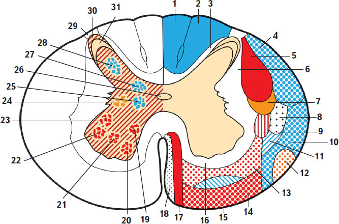 1, 2 – тонкий и клиновидный пучки; 3 – собственный (задний) пучок; 4 – задний спинно-мозжечковый путь; 5 – латеральный пирамидный (корково-спинномозговой) путь; 6 – собственный пучок (латеральный); 7 – красноядерно-спинномозговой путь; 8 – латеральный спинно-таламический путь; 9 – задний преддверно-спинномозговой путь; 10 – передний спинно-мозжечковый путь; 11 – спинно-покрышечный путь; 12 – оливоспинномозговой путь; 13 – ретикулоспинномозговой путь; 14 – преддверно-спинномозговой путь; 15 – передний спинно-таламический путь; 16 – собственный пучок (передний); 17 – передний пирамидный (корково-спинномозговой) путь; 18 – покрышечно-спинномозговой путь; 19 – задне-медиальное ядро; 20 – передне-медиальное ядро; 21 – центральное ядро; 22 – передне-латеральное ядро; 23 – задне-латеральное ядро; 24 – промежуточно-латеральное ядро; 25 – промежуточно-медиальное ядро; 26 – центральный канал; 27 – грудное ядро; 28 – собственное ядро (BNA); 29 – пограничная зона (BNA); 30 – губчатый слой; 31 – студенистое вещество