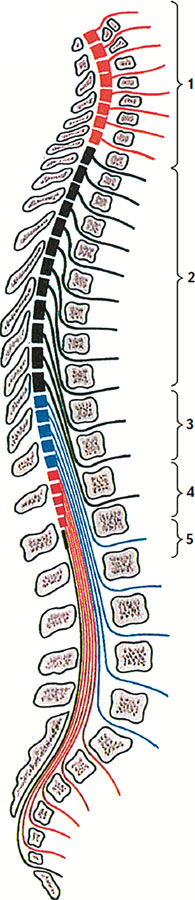 1 – шейные сегменты (CI–CVIII); 2 – грудные сегменты (ThI–ThXII); 3 – поясничные сегменты (LI–LV); 4 – крестцовые сегменты (SI–SV); 5 – копчиковые сегменты (CoI–CoIII)