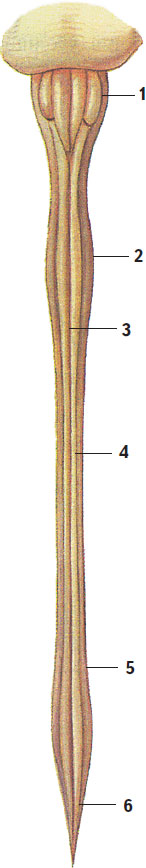 1 – продолговатый мозг; 2 – шейное утолщение; 3 – передняя срединная щель; 4 – передняя латеральная борозда; 5 – пояснично-крестцовое утолщение; 6 – мозговой конус