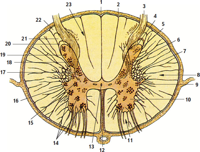 1 – задняя срединная борозда; 2 – заднелатеральная борозда; 3 – задний канатик; 4 – верхушка заднего рога; 5 – головка заднего рога; 6 – шейка заднего рога; 7 – ретикулярная формация; 8 – боковой канатик; 9 – боковой рог; 10 – передний рог; 11 – передний канатик; 12 – передняя срединная щель; 13 – центральный канал; 14 – ядра переднего рога; 15 – медиальное промежуточное ядро; 16 – латеральное промежуточное ядро; 17 – грудное ядро; 18 – собственное ядро заднего рога; 19 – задний рог; 20 – студенистое ядро; 21 – губчатая зона; 22 – краевая зона; 23 – задний канатик