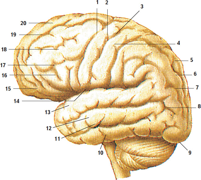 1 – предцентральная борозда; 2 – предцентральная извилина; 3 – центральная борозда; 4 – постцентральная извилина; 5 – верхняя теменная долька; 6 – внутритеменная борозда; 7 – нижняя теменная долька; 8 – угловая извилина; 9 – затылочный полюс; 10 – нижняя височная извилина; 11 – нижняя височная борозда; 12 – средняя височная извилина; 13 – верхняя височная извилина; 14 – латеральная (боковая) борозда; 15 – глазничная часть; 16 – нижняя лобная извилина; 17 – нижняя лобная борозда; 18 – средняя лобная извилина; 19 – верхняя лобная борозда; 20 – верхняя лобная извилина