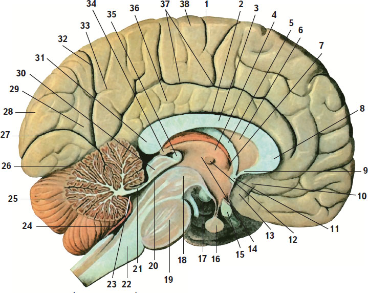1 – центральная борозда; 2 – борозда мозолистого тела; 3 – мозолистое тело; 4 – таламус; 5 – свод; 6 – прозрачная перегородка; 7 – межжелудочковое отверстие; 8 – колено мозолистого тела; 9 – клюв мозолистого тела; 10 – подмозолистое поле; 11 – передняя спайка; 12 – межталамическое сращение; 13 – паратерминальная извилина; 14 – промежуточный мозг; 15 – зрительный перекрест; 16 – гипофиз; 17 – сосцевидные тела; 18 – средний мозг; 19 – мост; 20 – водопровод среднего мозга; 21 – верхний мозговой парус; 22 – продолговатый мозг; 23 – IV желудочек; 24 – нижний мозговой парус; 25 – мозжечок; 26 – поперечная щель большого мозга; 27 – шпорная борозда; 28 – затылочная доля; 29 – клин; 30 – крыша среднего мозга; 31 – валик мозолистого тела; 32 – теменно-затылочная борозда; 33 – предклинье; 34 – шишковидная железа; 35 – задняя спайка; 36 – поясничная извилина; 37 – поясная борозда; 38 – парацентральная долька