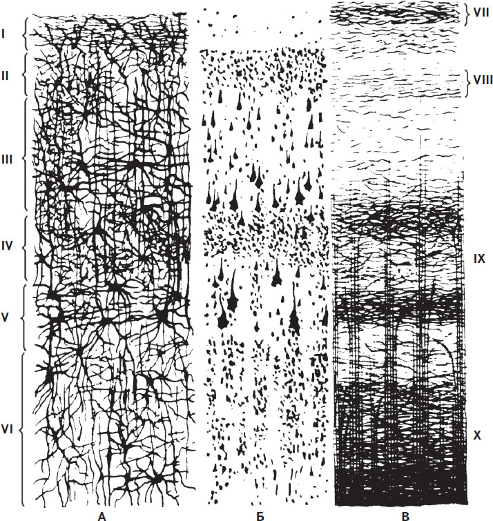 А – слои (пластинки) клеток; Б – типы клеток; В – слои волокон; I – молекулярная пластинка; II – наружная зернистая пластинка; III – наружная пирамидная пластинка; IV – внутренняя зернистая пластинка; V – внутренняя пирамидная пластинка; VI – мультиформная пластинка; VII – полоска молекулярной пластинки; VIII – полоска наружной зернистой пластинки; IX – полоска внутренней зернистой пластинки; X – полоска внутренней пирамидной пластинки