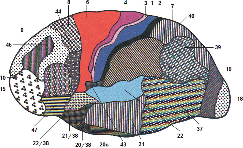 Рис. 159. Цитоархитектонические поля (на рисунке обозначены цифрами) левого полушария большого мозга; верхнелатеральная поверхность