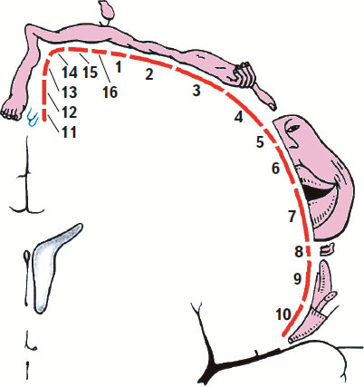 Изображения на поперечном срезе мозга (на уровне постцентральной извилины) и относящиеся к ним обозначения показывают пространственное представительство поверхности тела в коре полушария большого мозга: 1 – голова; 2 – рука; 3 – кисть; 4 – пальцы; 5 – глаз; 6 – лицо; 7 – губы; 8 – челюсть и зубы; 9 – язык; 10 – глотка; 11 – половые органы; 12 – стопа; 13 – нога; 14 – таз; 15 – торс; 16 – шея