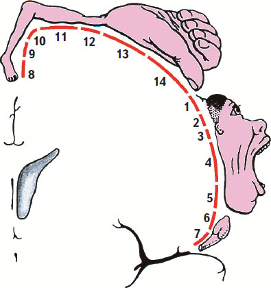 Изображение двигательного «гомункулюса» отражает относительные размеры областей представительства отдельных участков тела в коре предцентральной извилины полушария большого мозга: 1 – лоб; 2 – глаз и веко; 3 – лицо; 4 – мимические мышцы; 5 – челюсть; 6 – язык; 7 – глотка; 8 – стопа; 9 – нога; 10 – таз; 11 – торс; 12 – рука; 13 – кисть; 14 – пальцы