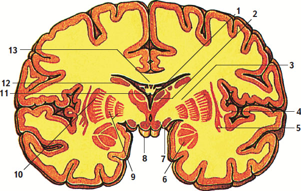 1 – сосудистое сплетение бокового желудочка (центральная часть); 2 – таламус; 3 – внутренняя капсула; 4 – кора островка; 5 – ограда; 6 – миндалевидное тело; 7 – зрительный тракт; 8 – сосцевидное тело; 9 – бледный шар; 10 – скорлупа; 11 – свод мозга; 12 – хвостатое ядро; 13 – мозолистое тело