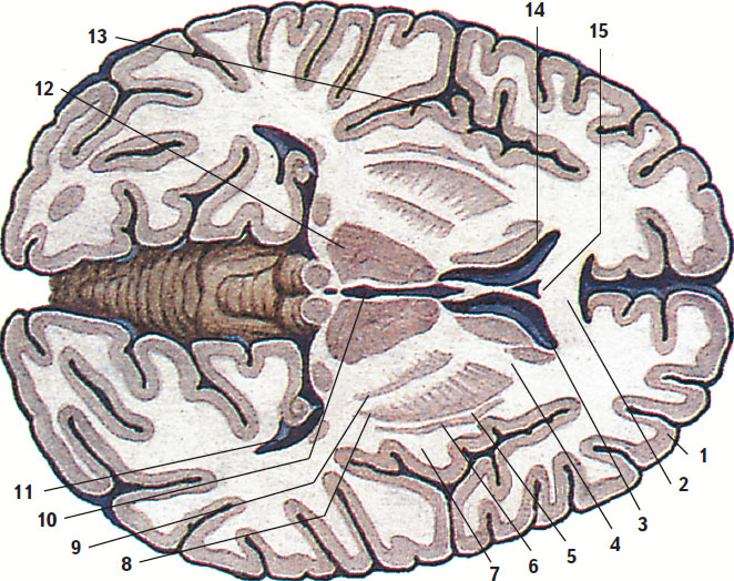 1 – кора большого мозга (плащ); 2 – колено мозолистого тела; 3 – передний рог бокового желудочка; 4 – внутренняя капсула; 5 – наружная капсула; 6 – ограда; 7 – самая наружная капсула; 8 – скорлупа; 9 – бледный шар; 10 – III желудочек; 11 – задний рог бокового желудочка; 12 – зрительный бугор; 13 – корковое вещество (кора) островка; 14 – головка хвостатого ядра; 15 – полость прозрачной перегородки