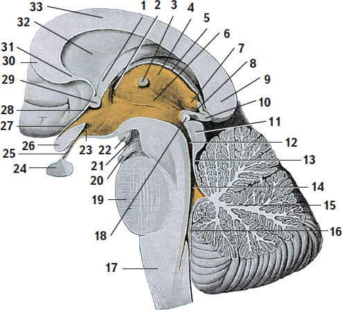 1 – столб свода; 2 – межжелудочковое отверстие; 3 – межталамическое сращение; 4 – таламус; 5 – сосудистое сплетение третьего желудочка; 6 – гипоталамическая борозда; 7 – треугольник поводка; 8 – шишковидное углубление; 9 – валик мозолистого тела; 10 – шишковидная железа; 11 – крыша среднего мозга; 12 – водопровод среднего мозга; 13 – верхний мозговой парус; 14 – четвертый желудочек; 15 – мозжечок; 16 – нижний мозговой парус; 17 – продолговатый мозг; 18 – задняя спайка; 19 – мост; 20 – корешок глазодвигательного нерва; 21 – заднее продырявленное вещество; 22 – сосцевидное тело; 23 – углубление воронки; 24 – гипофиз; 25 – воронка; 26 – перекрест зрительных нервов; 27 – супраоптическое углубление; 28 – терминальная пластинка; 29 – передняя спайка; 30 – колено мозолистого тела; 31 – клюв мозолистого тела; 32 – прозрачная перегородка: 33 – ствол мозолистого тела