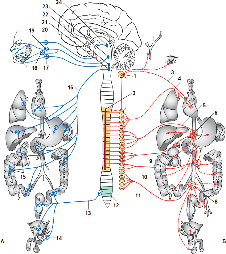 1 – верхний шейный узел симпатического ствола; 2 – боковой рог (столб) спинного мозга; 3 – верхний шейный сердечный нерв; 4 – грудные сердечные и легочные нервы; 5 – большой внутренностный нерв; 6 – чревное сплетение; 7 – верхнее подчревное сплетение; 8 – нижнее подчревное сплетение; 9 – малый внутренностный нерв; 10 – поясничные внутренностные нервы; 11 – крестцовые внутренностные нервы; 12 – крестцовые парасимпатические ядра; 13 – тазовые внутренностные нервы; 14 – тазовые (парасимпатические) узлы; 15 – парасимпатические узлы (в составе органных сплетений); 16 – блуждающий нерв; 17 – ушной (парасимпатический) узел; 18 – подчелюстной (парасимпатический) узел; 19 – крыловидно-небный (парасимпатический) узел; 20 – ресничный (парасимпатический) узел; 21 – дорсальное ядро блуждающего нерва; 22 – нижнее слюноотделительное ядро; 23 – верхнее слюноотделительное ядро; 24 – добавочное ядро глазодвигательного нерва. Стрелками показаны пути нервных импульсов к органам