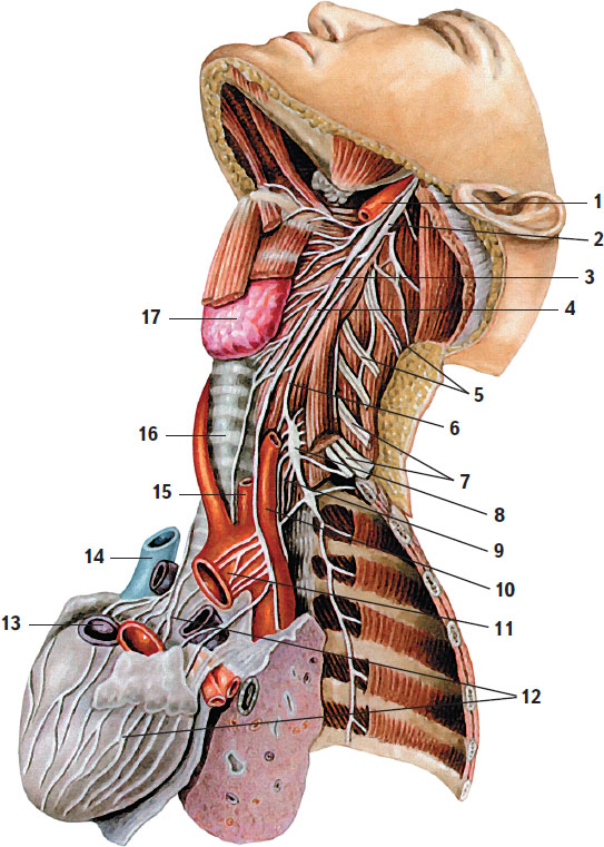 1 – внутренняя сонная артерия; 2 – верхний шейный узел симпатического ствола; 3 – блуждающий нерв; 4 – верхний шейный сердечный нерв; 5 – шейное сплетение; 6 – симпатический ствол; 7 – плечевое сплетение; 8 – шейно-грудной узел; 9 – нижний шейный сердечный нерв; 10 – левая подключичная артерия; 11 – дуга аорты;12 – нервы сердечного сплетения; 13 – легочный ствол; 14 – верхняя полая вена; 15 – левая общая сонная артерия; 16 – трахея; 17 – щитовидная железа