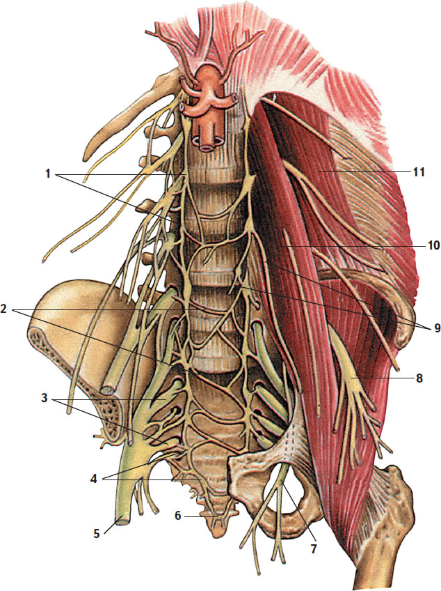 1 – поясничный отдел симпатического ствола; 2 – поперечные соединительные ветви; 3 – крестцовое сплетение; 4 – крестцовые узлы; 5 – седалищный нерв; 6 – непарный (крестцовый) узел; 7 – запирательный нерв; 8 – бедренный нерв; 9 – поясничные внутренностные нервы; 10 – большая поясничная мышца; 11 – квадратная мышца поясницы