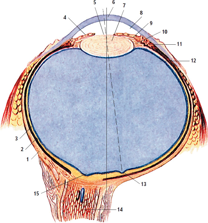 1 – фиброзная оболочка (склера); 2 – собственно сосудистая оболочка; 3 – сетчатка; 4 – радужка; 5 – зрачок; 6 – роговица; 7 – хрусталик; 8 – передняя камера глазного яблока; 9 – задняя камера глазного яблока; 10 – ресничный поясок; 11 – ресничное тело; 12 – стекловидное тело; 13 – центральная ямка; 14 – зрительный нерв; 15 – диск зрительного нерва