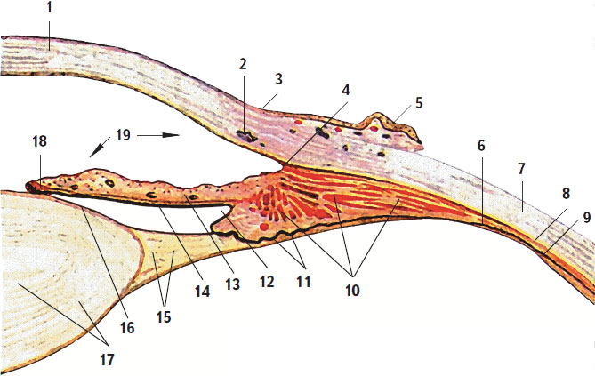 1 – роговица; 2 – венозный синус склеры; 3 – лимб (край роговицы); 4 – радужно-роговичный угол; 5 – конъюнктива; 6 – ресничная часть сетчатки; 7 – склера; 8 – сосудистая оболочка; 9 – зубчатый край сетчатки; 10 – ресничная мышца; 11 – ресничные отростки; 12 – задняя камера глазного яблока; 13 – радужка; 14 – задняя поверхность радужки; 15 – ресничный поясок; 16 – капсула хрусталика; 17 – хрусталик; 18 – сфинктер зрачка (мышца, суживающая зрачок); 19 – передняя камера глазного яблока