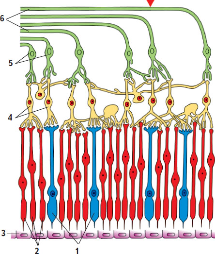 1 – колбочки; 2 – палочки; 3 – пигментные клетки; 4 – биполярные клетки; 5 – ганглиозные клетки; 6 – нервные волокна. Красной стрелкой показано направление пучка света