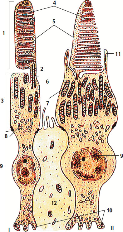Рис. 186. Палочковидная (I) и колбочковидная (II) зрительные клетки – фоторецепторные клетки. Ультрамикроскопическое строение: