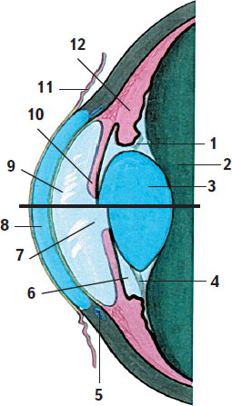 1 – ресничный поясок (расслаблен); 2 – стекловидное тело; 3 – хрусталик; 4 – ресничный поясок (натянут); 5 – венозный синус склеры; 6 – задняя камера глазного яблока; 7 – зрачок; 8 – роговица; 9 – передняя камера глазного яблока; 10 – радужка; 11 – конъюнктива; 12 – ресничное тело