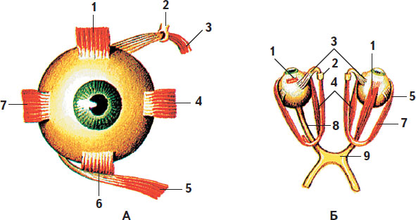 1 – верхняя прямая мышца; 2 – блок; 3 – верхняя косая мышца; 4 – медиальная прямая мышца; 5 – нижняя косая мышца; 6 – нижняя прямая мышца; 7 – латеральная прямая мышца; 8 – зрительный нерв; 9 – перекрест зрительных нервов