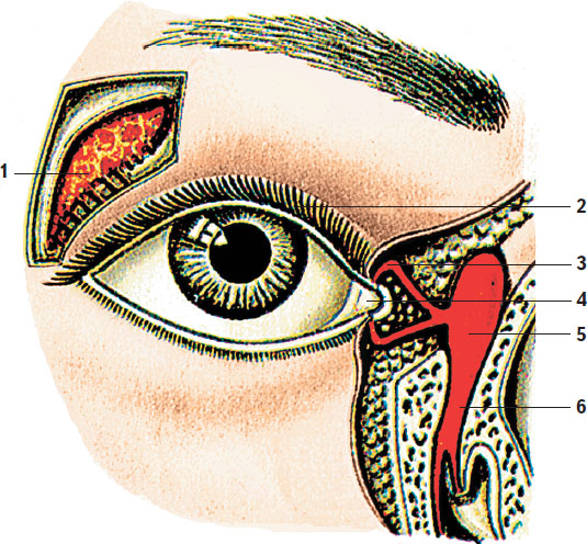 1 – слезная железа; 2 – верхнее веко; 3 – слезный каналец; 4 – слезное озеро; 5 – слезный мешок; 6 – носослезный проток