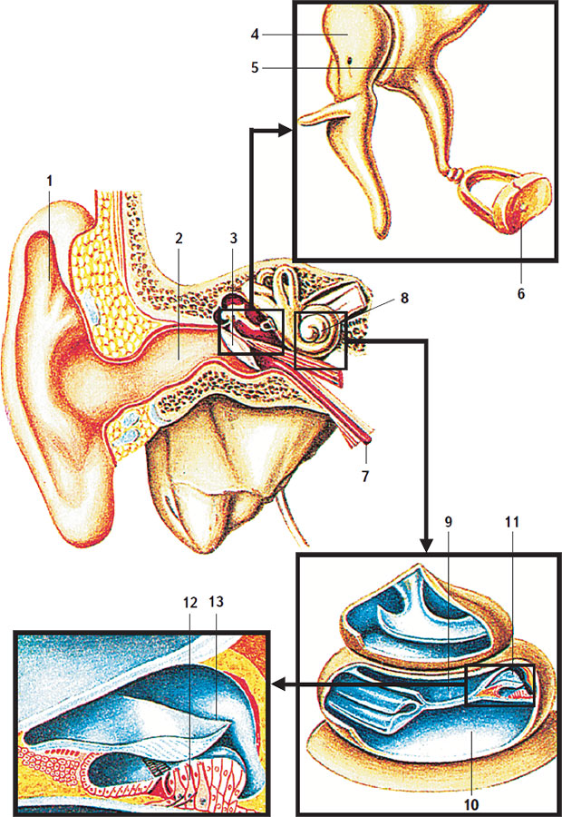 1 – ушная раковина; 2 – наружный слуховой проход; 3 – барабанная перепонка; 4 – молоточек; 5 – наковальня; 6 – стремя; 7 – слуховая труба; 8 – улитка; 9 – лестница преддверия; 10 – барабанная лестница; 11 – улитковый проток; 12 – спиральный (кортиев) орган; 13 – покровная мембрана