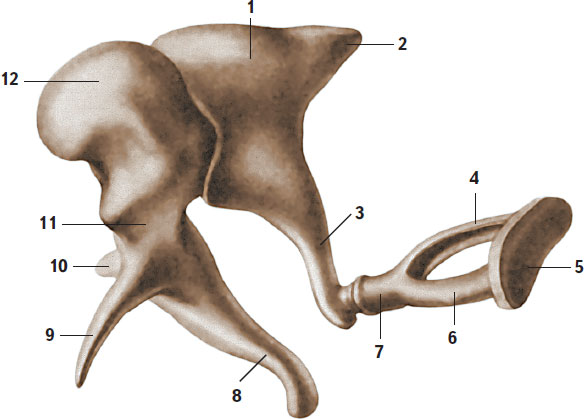 1 – наковальня; 2 – короткая ножка наковальни; 3 – длинная ножка наковальни; 4 – задняя ножка стремени; 5 – основание стремени; 6 – передняя ножка стремени; 7 – головка стремени; 8 – рукоятка молоточка; 9 – передний отросток молоточка; 10 – латеральный отросток молоточка; 11 – шейка молоточка; 12 – головка молоточка