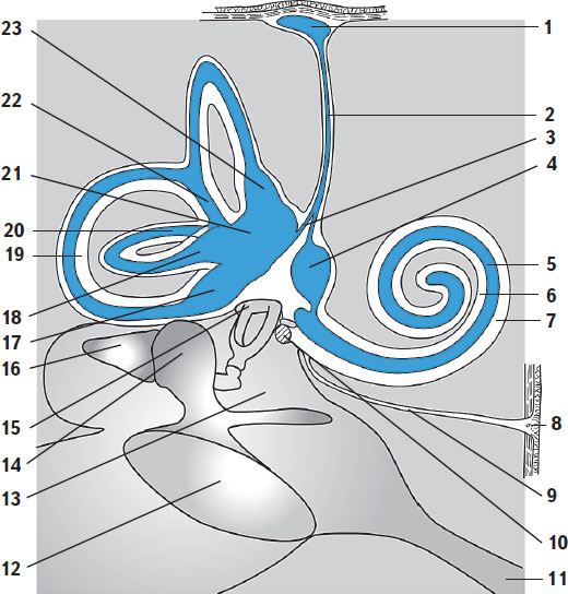 1 – эндолимфатический мешочек; 2 – эндолимфатический проток; 3 – проток эллиптического мешочка; 4 – сферический мешочек; 5 – улитковый проток; 6 – лестница преддверия; 7 – барабанная лестница; 8 – наружное отверстие канальца (водопровода) улитки; 9 – перилимфатический проток (водопровод) улитки; 10 – окно улитки; 11 – слуховая труба; 12 – барабанная перепонка; 13 – барабанная полость; 14 – молоточек; 15 – основание стремени; 16 – наковальня; 17 – ампула заднего полукружного протока; 18 – ампула латерального полукружного протока; 19 – перилимфатическое пространство заднего (костного) полукружного канала; 20 – перепончатая ножка (латеральный полукружный проток); 21 – эллиптический мешочек; 22 – общая перепончатая ножка; 23 – передняя (верхняя) перепончатая ампула