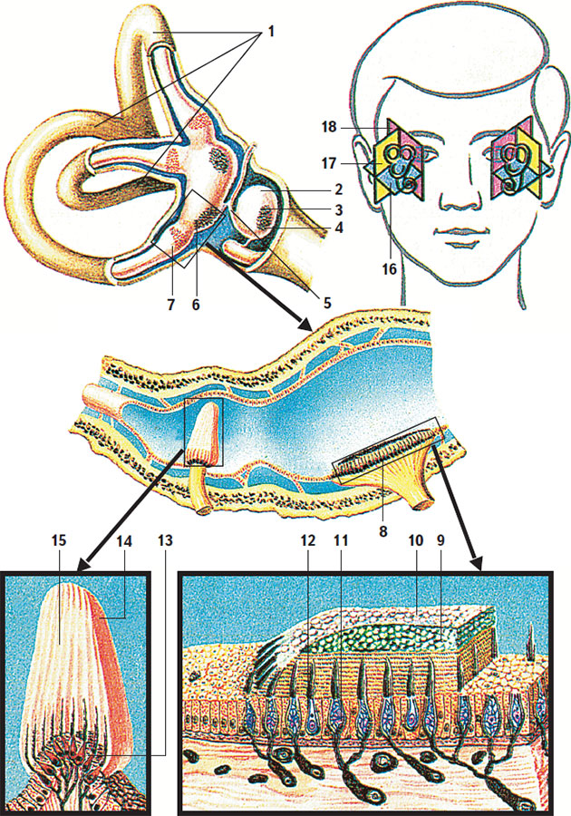1 – полукружные каналы; 2 – преддверие; 3 – сферический мешочек; 4 – пятно сферического мешочка; 5 – эндолимфатический проток; 6 – эллиптический мешочек; 7 – ампула; 8 – отолитовый аппарат; 9 – статоконии; 10 – мембрана статоконий; 11 – поддерживающие клетки; 12, 13 – волосковые (сенсорные) клетки; 14 – ампульный гребешок; 15 – купол; 16 – латеральный полукружный канал; 17 – передний полукружный канал; 18 – задний полукружный канал