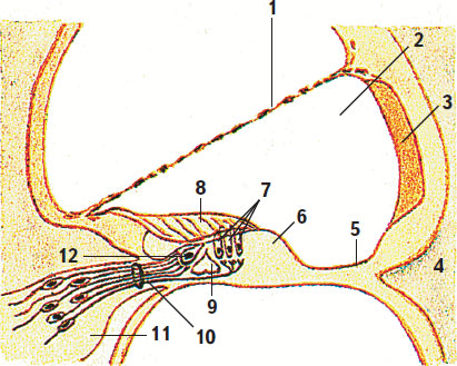1 – преддверная мембрана; 2 – улитковый проток; 3 – сосудистая полоска; 4 – кость; 5 – базилярная пластинка; 6 – спиральный (кортиев) орган; 7 – наружные волосковые клетки спирального (кортиева) органа; 8 – покровная мембрана; 9 – внутренний туннель; 10 – нервные волокна; 11 – узел (спиральный) улитки; 12 – внутренняя волосковая клетка