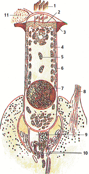 1 – слуховые волоски; 2 – кутикула; 3 – сетчатая мембрана; 4 – оболочка клетки; 5 – митохондрия; 6 – эндоплазматическая сеть; 7 – ядро; 8 – фаланговая пластинка наружной поддерживающей клетки; 9 – нервные окончания; 10 – митохондрии в нервном окончании; 11 – микроворсинки на опорных клетках