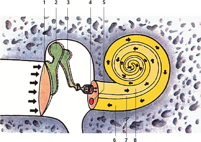 1 – барабанная перепонка; 2 – молоточек; 3 – наковальня; 4 – стремя; 5 – круглое окно; 6 – барабанная лестница; 7 – улитковый проток; 8 – лестница преддверия