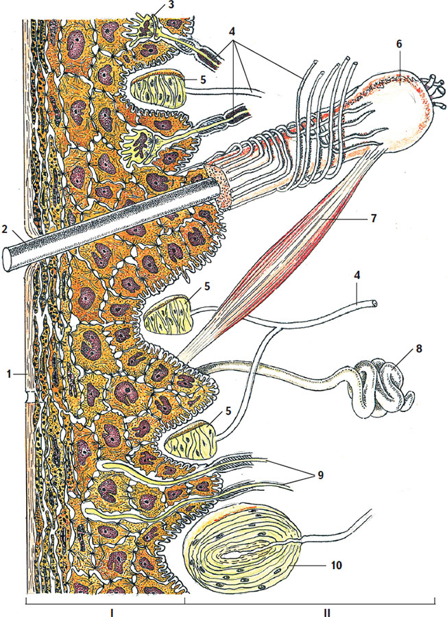 I – эпидермис; II – дерма; 1 – роговой слой; 2 – стержень волоса; 3 – клетка Меркеля; 4 – нервное окончание; 5 – осязательное тельце (Мейснера); 6 – волосяная сумка; 7 – мышца-подниматель волоса; 8 – потовая железа; 9 – свободное нервное окончание; 10 – пластинчатое тельце (Фатера-Пачини)