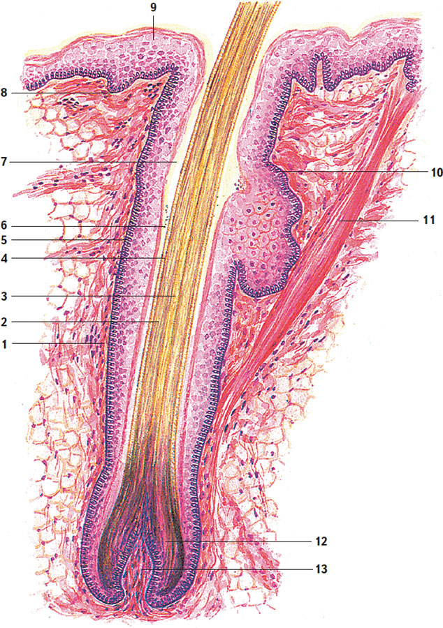 1 – волосяная сумка; 2 – кора волоса; 3 – мозговое вещество волоса; 4 – кутикула; 5 – наружное корневое влагалище; 6 – два слоя внутреннего корневого влагалища; 7 – волосяная воронка; 8 – базальный (ростковый) слой эпидермиса; 9 – роговой слой эпидермиса; 10 – сальная железа; 11 – мышца, поднимающая волос; 12 – луковица волоса; 13 – сосочек волоса