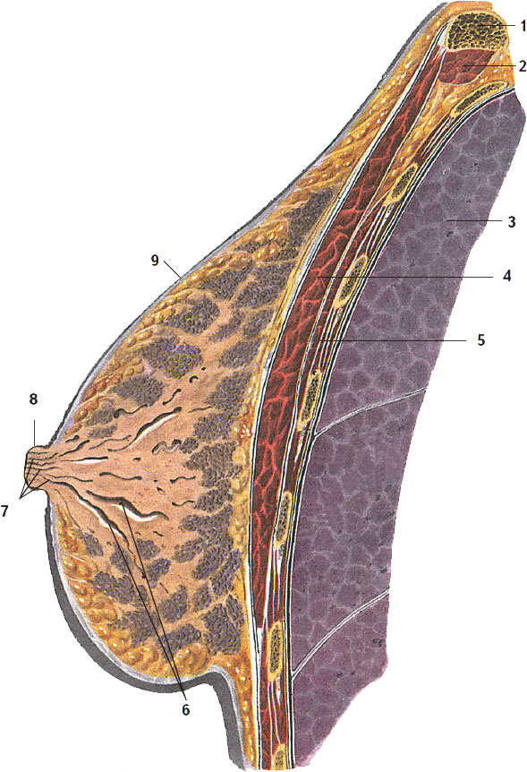 1 – ключица; 2 – подключичная мышца; 3 – легкое; 4 – большая грудная мышца; 5 – малая грудная мышца; 6 – молочный синус; 7 – молочные ходы; 8 – сосок; 9 – молочная железа