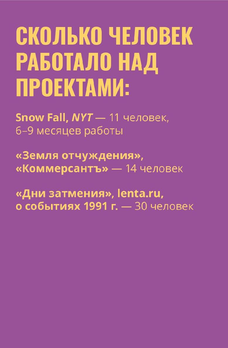 Не увеличиваем искусственно объем текста. Лучше меньше, да лучше – вспомни Snow Fall и Firestorm из первой главы. Согласись, что визуально верстка текста во втором проекте была читабельнее. Пользователь не любит текстовых лавин, давай текст небольшими блоками. Тому, чтобы много текста не смотрелось как «много», помогут вижуалы, грамотная верстка и дизайн.