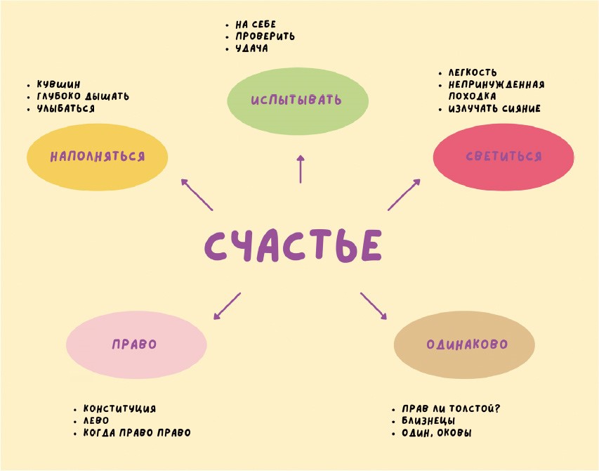 ● Любые первые пришедшие на ум ассоциации, связанные с контрольным словом. Скажем, контрольное слово «счастье» в центре листа, вокруг пишем все ассоциативные слова – например, глаголы: испытать, светиться, наполняться и т. д. Чем больше, тем лучше. Не меньше 10–15. От каждого из них – свои ассоциативные слова, и так несколько кругов.