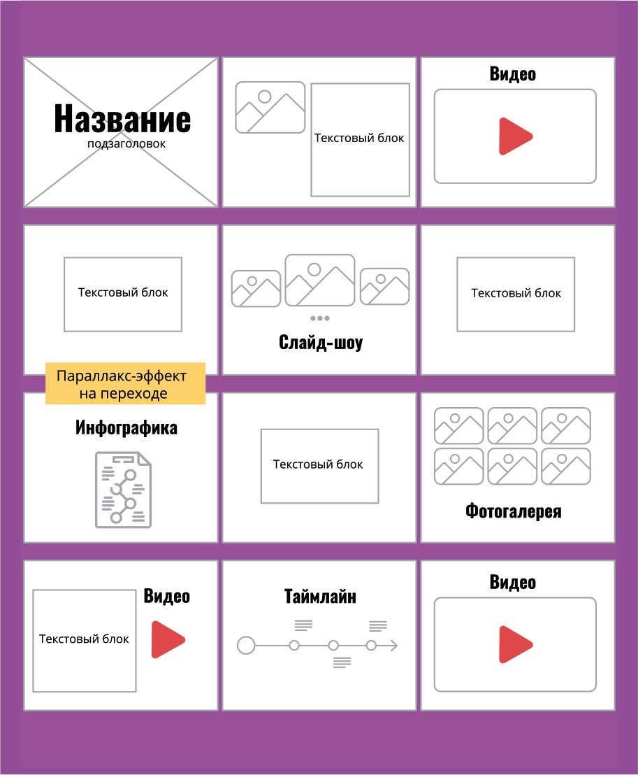 Макет поможет заранее определить, какие мультимедийные элементы будут использованы, какое количество текста необходимо написать, будет ли использовано навигационное меню и каким образом оно будет реализовано в проекте, какие фотографии и видео снять и каким образом будет выстроено повествование визуально. Без предварительного макета обойтись не получится!