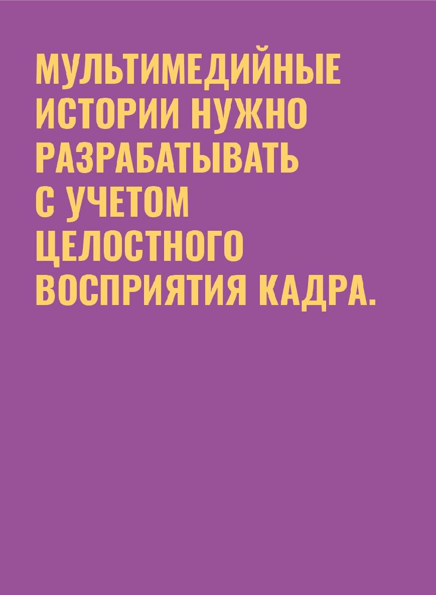 Всегда держим в голове: какую именно историю мы хотим рассказать? Почему именно в формате мультимедийного проекта? В виде какого именно мультимедийного проекта: лонгрида (текстоцентричен), вебдока (видеоцентричен), большой интерактивной инфографики, таймлайна, игры или др.? Какие мультимедийные форматы внутри этого проекта у нас могут быть? Почему именно они?