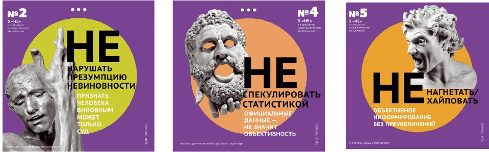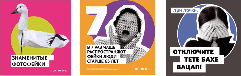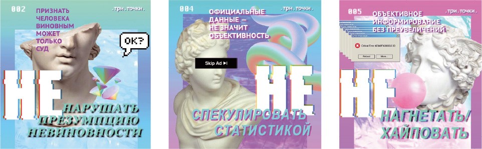 Когда я придумала концепцию информационной кампании по развитию медиаграмотности в соцсетях, которую назвала «.три. точки.», я решила: контент, который мы создаем, обязательно будет визуальным. Мы с командой тщательно работали над тем, КАК будет выглядеть то, ЧТО мы хотим сказать. В течение полутора лет мы следовали этому принципу. Несколько раз меняли визуальный стиль, пытаясь найти середину между собственным вкусом и тем, что зайдет аудитории. Не все наши визуальные решения приходились последней по нраву.