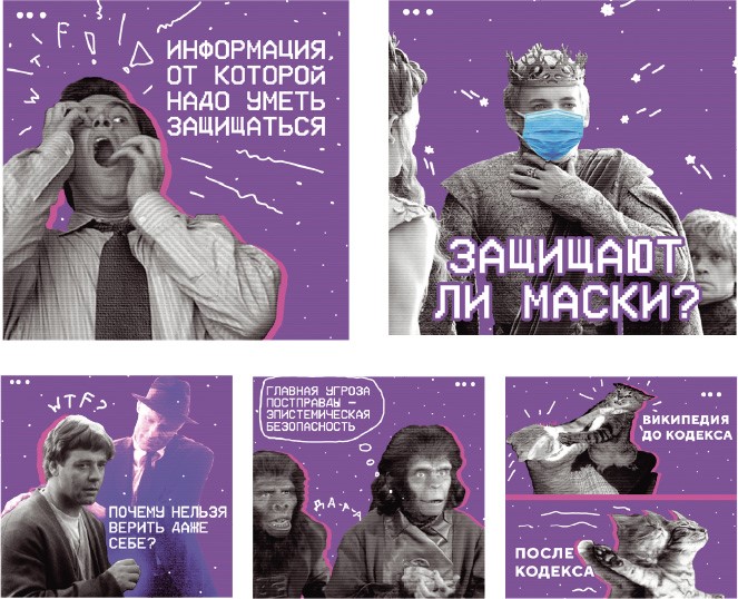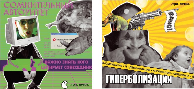 Дальше мы начинаем создавать сложные коллажи. Они намеренно «аляпистые» (порой цвета «вырви глаз»), многослойные: чтобы прочитать информацию на них, нужно сосредоточиться. Текст, который сопровождает карточки с гопником и Джокером о том, как правильно спорить. Оформление, помимо этого, имеет еще одну цель: показать аудитории сложность информационного потока. Посмотрите еще раз на эти коллажи! Прочитали ли вы сообщение, спрятанное в них, или увидели только образы и заголовки? Вот и информация в сети сегодня выглядит так же. Чтобы уловить нужное, нужно суметь найти его на большой информационной свалке.