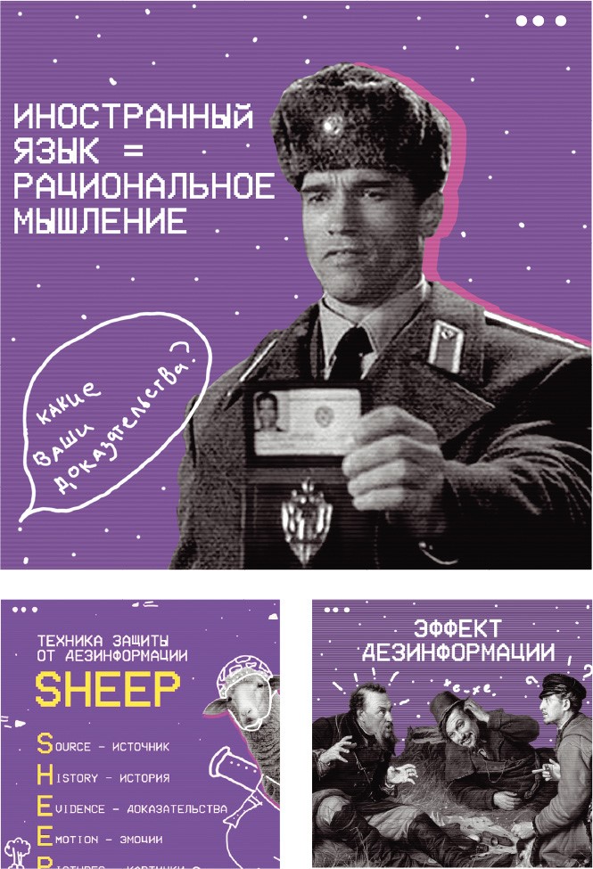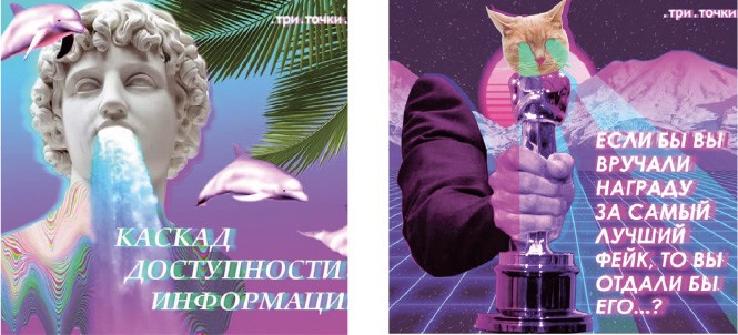 К середине кампании наш вижуал представлен в стиле киберпанк. Неон, сюрреалистичные образы, много розово-фиолетовых оттенков, картинки на грани китча, «плывущие» шрифты с градиентом. Мы хулиганили, и, если честно, этот наш период я люблю в проекте «.три. точки.» больше всего. В это время мы пошли на поводу своих желаний: хотелось супернеобычного подхода к теме медиаграмотности, рассказать про нее так, как еще никто не рассказывал. Делать контент, который бы раздражал, вызывал яркие эмоции. Аудитория мгновенно увидела разницу между тем, что мы делали до этого, и тем, что предлагали ей теперь.