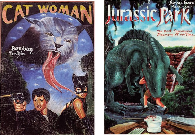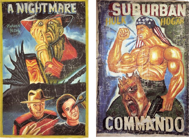 Рисованные киноафиши Ганы 1980–1990-х гг. В порядке очередности: супергеройский фильм «Женщина-кошка», научно-фантастический боевик «Парк Юрского периода», фильм ужасов «Кошмар на улице Вязов», комедия «Коммандо из пригорода». Опубликованы на сайте .