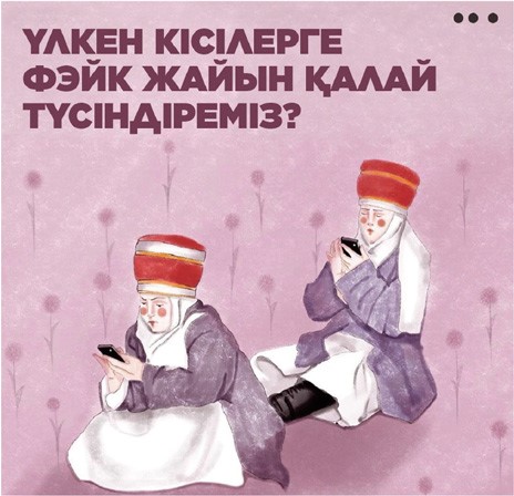 Перевод надписи: «Как объяснить пожилым людям, что такое фейк?» Изображение опубликовано в инстапроекте @3nukte (преемники кампании «.три. точки.» на казахском языке)